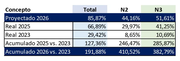 El impacto del nuevo esquema se evidencia con precisión al desagregar por nivel de ingresos. En el caso de los usuarios N2, la cobertura pasó del 8,65% en 2023 al 29,97% en 2025, proyectándose un alcance del 44,16% en 2026. Esto implica una variación acumulada del 410,52% respecto al punto de partida. Para los usuarios N3, la cobertura se elevó del 10,69% en 2023 al 41,25% en 2025, con una proyección del 51,61% en 2026, lo que representa un incremento acumulado del 382,79%.