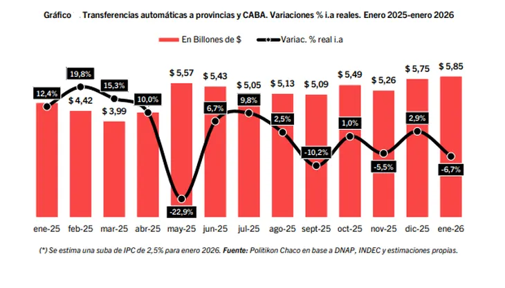 Según el informe de Politikón Chaco, en enero “las transferencias automáticas de recursos de origen nacional distribuidas al consolidado de provincias y CABA totalizaron $5,85 billones, evidenciando un descenso real del 6,7% interanual; a su vez, en comparación con el mes precedente, también registraron un retroceso, si bien de menor magnitud (-0,7% real mensual)”.