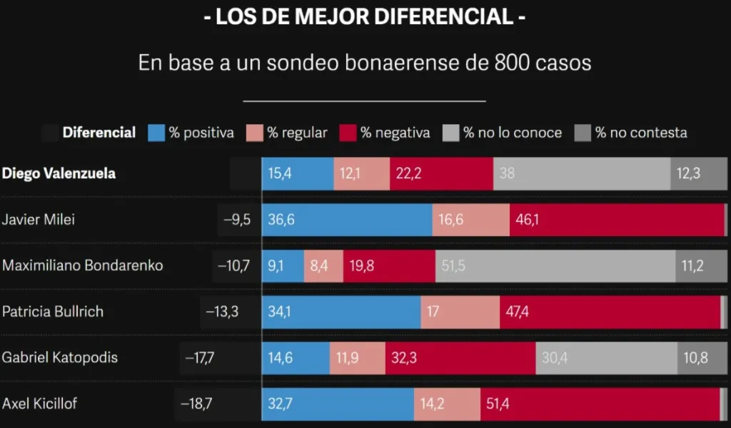 El intendente libertario Diego Valenzuela lideró la tabla con un diferencial de imagen de -6,8 puntos (15,4?% positiva y 22,2?% negativa), por delante del Presidente Javier Milei, quien obtuvo un balance negativo de -9,5 puntos (36,6?% de imagen favorable y 46,1?% desfavorable). No obstante, Milei fue el dirigente más conocido: apenas el 0,1?% afirmó no conocerlo, frente a un 38?% en el caso de Valenzuela.