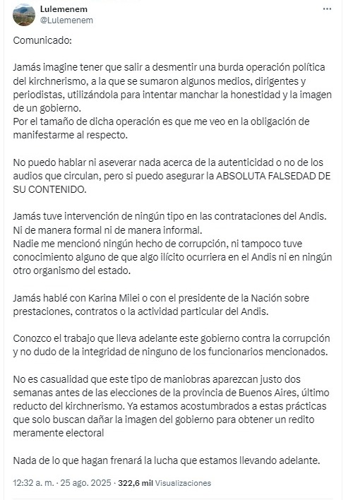 Las sospechas contra Menem surgieron a partir de los audios atribuidos al exdirector de la ANDIS, Diego Spagnuolo, que desataron una fuerte crisis en el Gobierno. Aunque evitó pronunciarse sobre la veracidad de esas grabaciones, fue terminante respecto de su contenido. “Puedo asegurar la ABSOLUTA FALSEDAD de lo que allí se dice”, escribió en sus redes sociales.