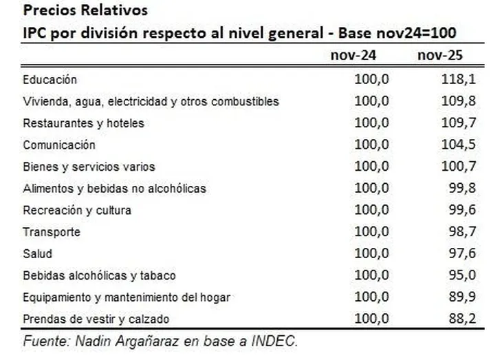 “Considerando únicamente el último año, el precio relativo que más se incrementó corresponde a la educación, con un 18%, y el que más se redujo es el de prendas de vestir, con un 12%. Los alquileres y servicios públicos se ubicaron en segundo lugar, con un aumento del 10%”, señala el reporte.