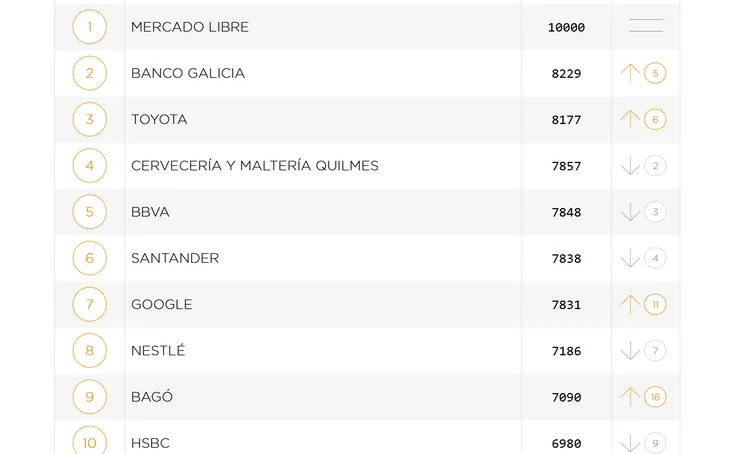 En segundo lugar quedó Banco Galicia (2do lugar) y le siguen: Toyota (3er lugar), Cervecería y Maltería Quilmes (4to lugar), BBVA (5to lugar), Santander (6to lugar), Google (7mo lugar), Nestlé (8vo lugar), Bagó (9no lugar) y HSBC (10mo lugar).