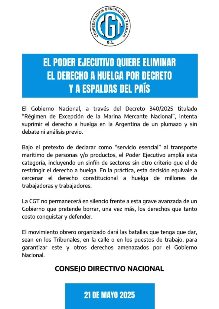 La central obrera denunció en un comunicado que el Gobierno “intenta suprimir el derecho a huelga en la Argentina de un plumazo y sin debate ni análisis previo”. Calificó de “pretexto” el objetivo de declarar servicio esencial la actividad de la Marina Mercante Nacional y afirmó que no tienen ningún criterio, sólo eliminar este instrumento de lucha del movimiento obrero.