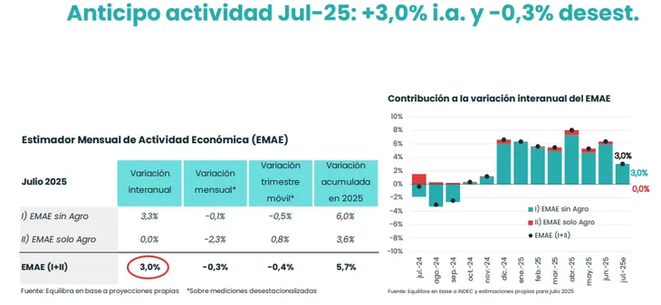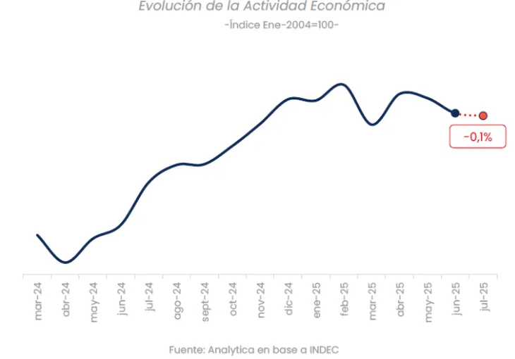“Con la caída prevista para julio, la actividad económica tuvo cinco de siete meses con variaciones negativas en lo que va de 2025, manteniéndose 0,8% por debajo del nivel de diciembre. La economía habría entrado en una etapa de estancamiento, expresando los límites para el crecimiento del actual esquema que mantiene encorsetada a la demanda para sostener el régimen monetario y cambiario”, sostuvieron desde Analytica.
